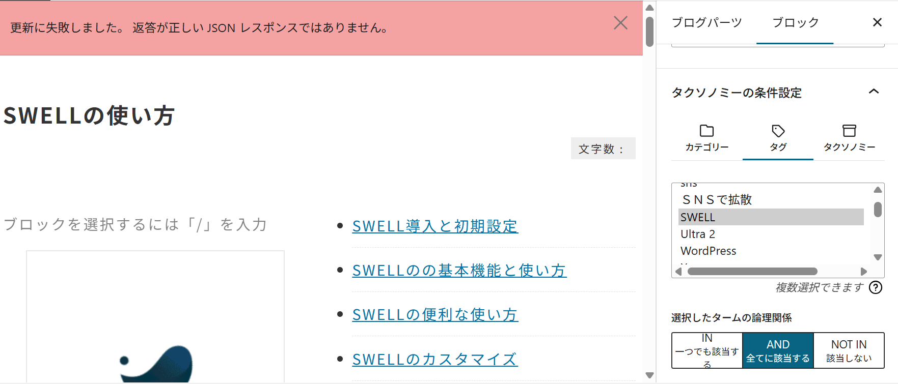 現在、ブログパーツにて `loos/post-list` ブロックを使用し、タグを2つ指定して「両方に該当する(AND)」条件で記事一覧を表示しようとしたところ、保存時に以下のエラーが発生します。