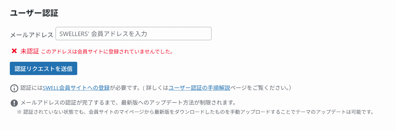 SWELL アクティベート設定画面の話だと思いますが、間違ったメールアドレスを入力すると「このアドレスは会員サイトに登録されていませんでした。」と表示されませんか?