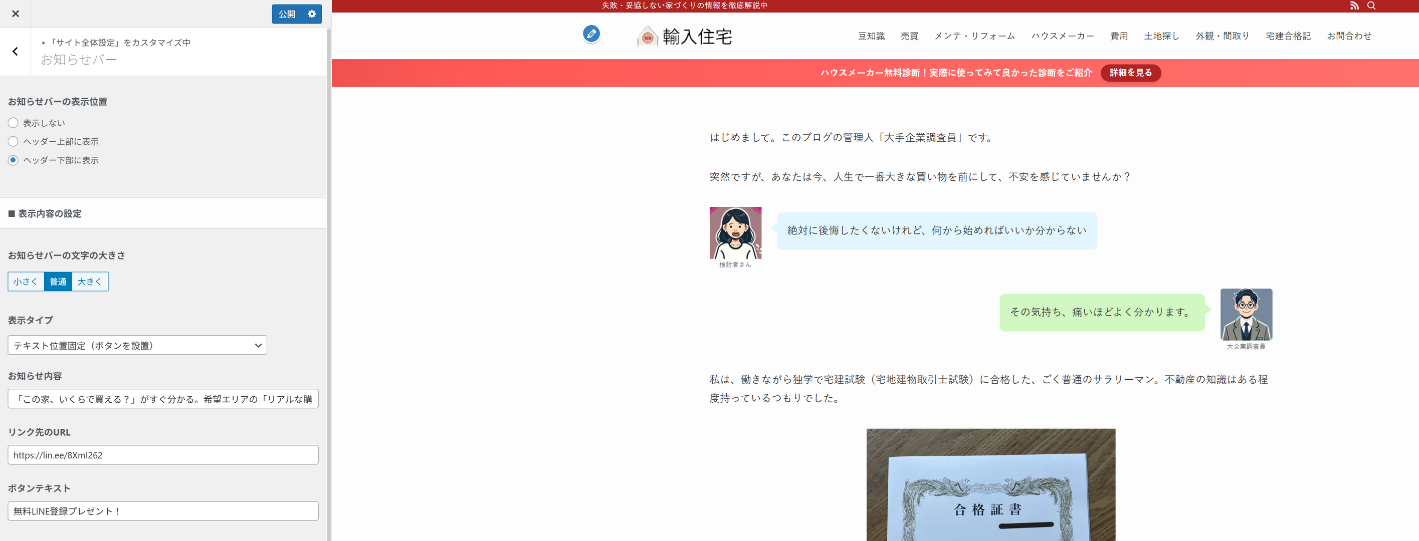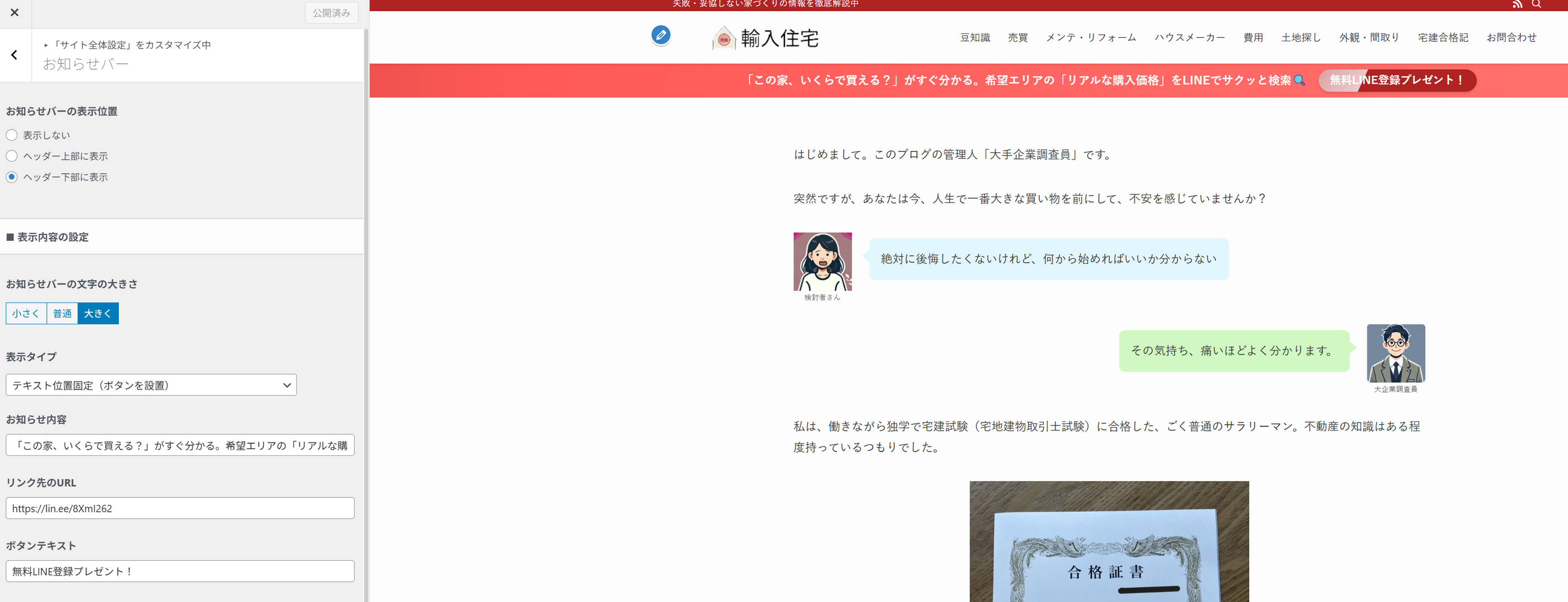 【発生している現象】 カスタマイザーの「サイト全体設定」→「お知らせバー」にて、「お知らせ内容・リンク先のURL・ボタンテキスト」を入力し「公開(保存)」を押しております。ただ保存完了後、「お知らせバーの文字の大きさ」等を変更すると大昔に保存した、「お知らせ内容・リンク先のURL・ボタンテキスト」に書き換わってしまいます。何度試しても登録したい、「お知らせ内容・リンク先のURL・ボタンテキスト」で保存ができません。