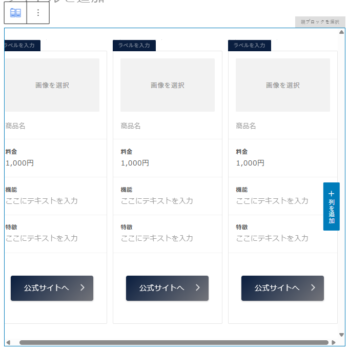 比較表なんですが、これはJINRのものです。スタイルも見栄えが良いのと、縦軸、横軸、+ボタンを押すだけで同じ項目がコピーされて出るので非常に効率よく作れます。SWELLも比較表は作れますが、見た目や効率面が悪く感じます。